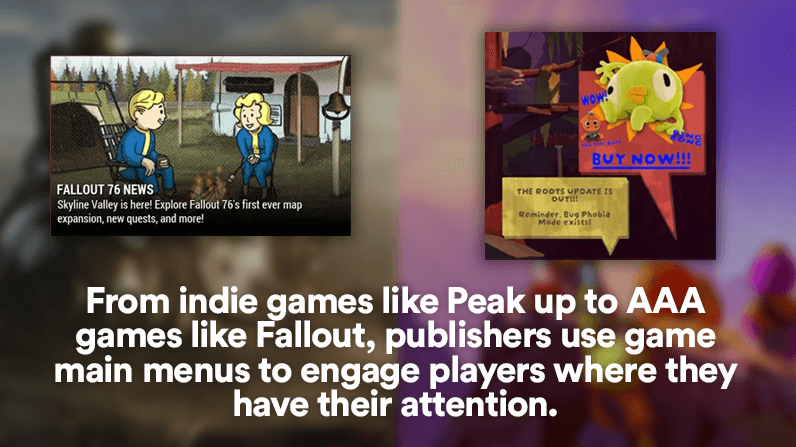 The main menu, pause screen, and loading screens are the last meaningful pieces of real estate where you truly have a player’s attention. When implemented naturally and diegetically, they become direct communication channels for news, changelogs, events, promotions, and updates.